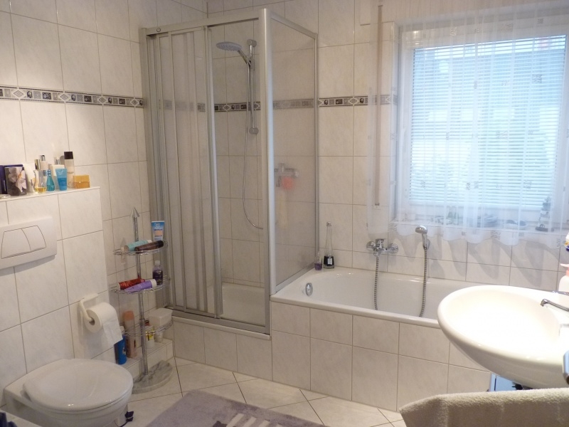 Im Obergeschoss befinden sich 3 Zimmer und ein großzügiges Bad mit Dusche und Wanne.