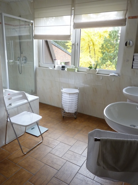Das geräumige Badezimmer ist mit einem großen Fenster, Badewanne und Dusche sowie zwei Waschbecken ausgestattet.