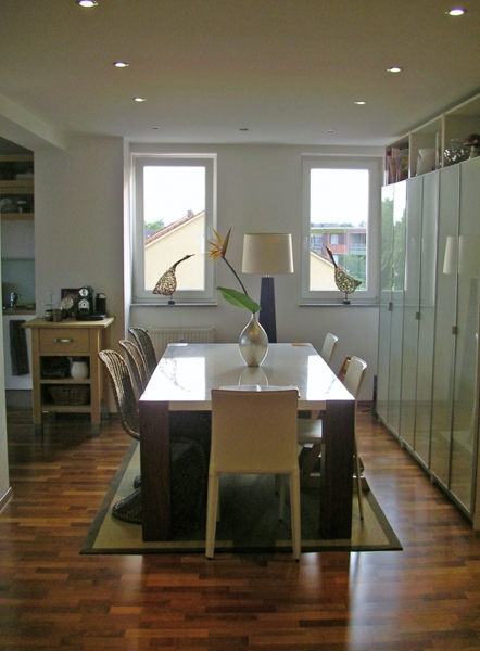 Wohn- und Essbereich sowie die Küche sind offen gestaltet. Hierdurch bietet sich in Verbindung mit großen, teils bodentiefen Fenstern ein großzügiges und lichtdurchflutetes Raumerlebnis.