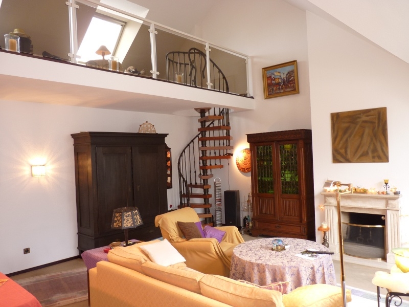 Das Wohnzimmer überzeugt durch sein außergewöhnliches Ambiente: durch die Wendeltreppe gelangen Sie auf die offene Galerie.