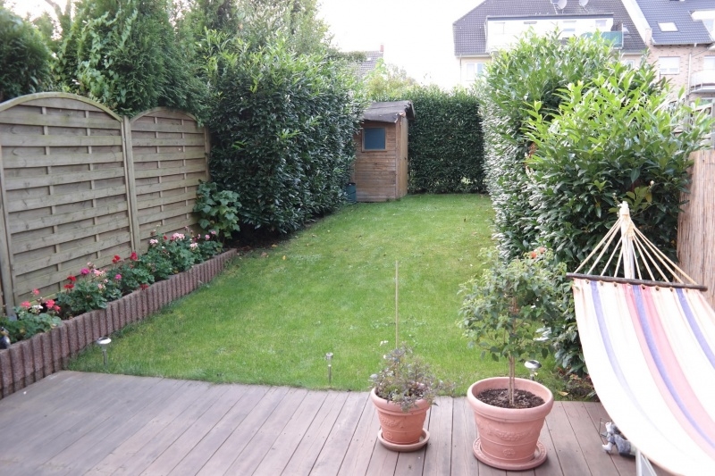 Neben einer großzügigen Holzterrasse gibt es einen Gartenbereich zur alleinigen Nutzung, wo Sie den Feierabend ausklingen oder Ihr Kind spielen lassen können.
