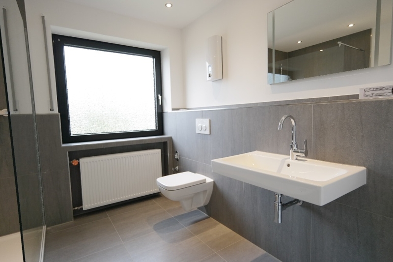 Das Tageslichtbad wurde liebevoll modernisiert und mit stilvollen Sanitärobjekten ausgestattet. Der Blickfang des Badezimmers ist die große, offene und bodentiefe Dusche.