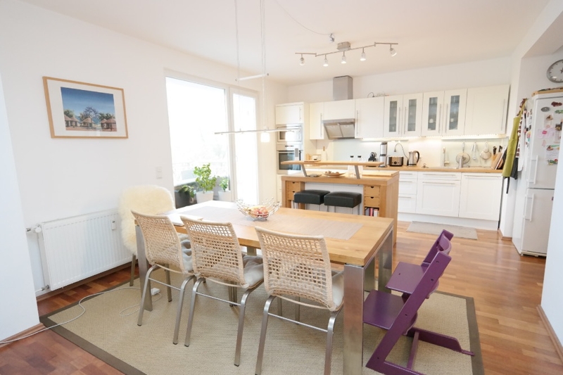 Der Wohn- und Essbereich sowie die Küche sind offen gestaltet. Hierdurch bietet sich in Verbindung mit großen, teils bodentiefen, Fenstern ein großzügiges und lichtdurchflutetes Raumerlebnis.